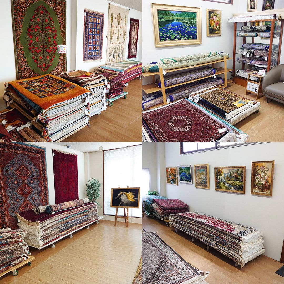 広島県にある絨毯やかた本店では、「ペルシャ絨毯」「ギャッベ」「トライバル・ヴィンテージラグ」を合わせて500枚以上展示中。